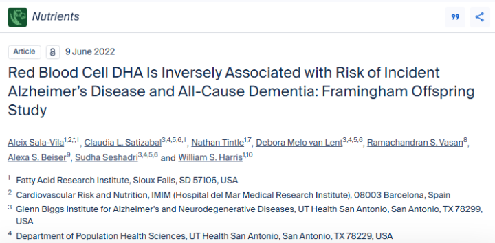 无独有偶,《Nutrients》上一项涉及近1500名年龄>65岁的未痴呆受试者的研究结果显示,血液内DHA水平较高的受试者罹患阿尔兹海默症的风险会下降49%。