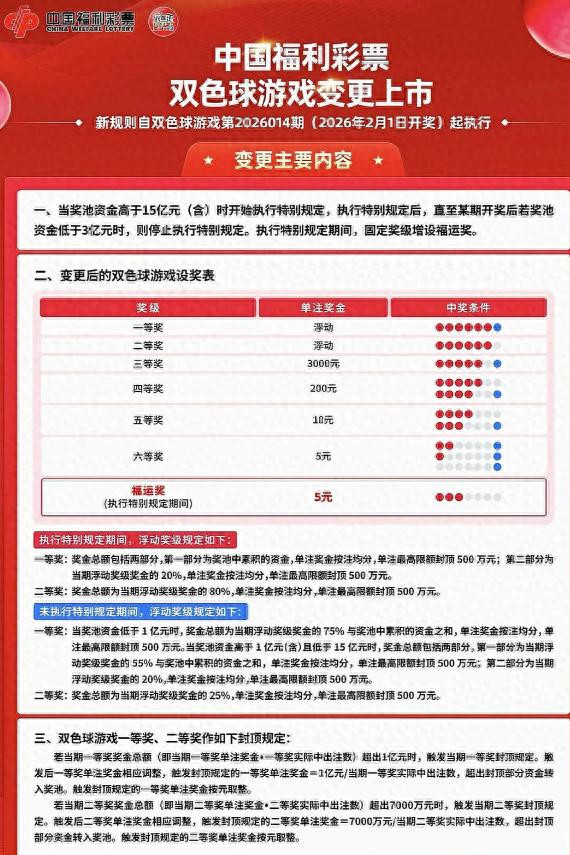 新规落地后,只要当期奖池资金在15亿元及以上,就会自动启动特别规定,固定奖级里多出一个福运奖,只中3个红球就能拿到5元奖金。