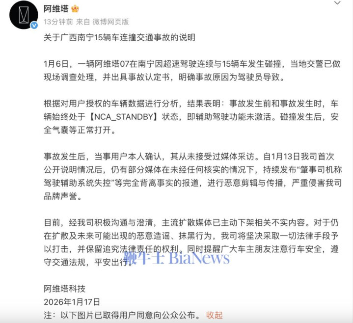 1月6日,一辆阿维塔07在南宁因超速驾驶连续与15辆车发生碰撞,当地交警已做现场调查处理,并出具事故认定书,明确事故原因为驾驶员导致。