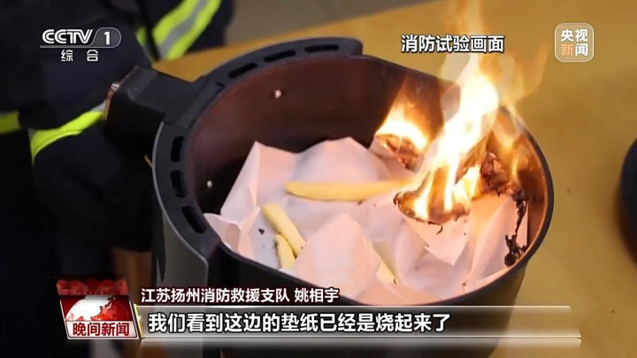 总台央视记者王晨:在刚才的消防试验中,空气炸锅里的垫纸被点燃。空气炸锅工作时温度可以达到上百摄氏度,如果食物放置太少或者是不均匀,就很容易造成这样的隐患。