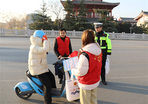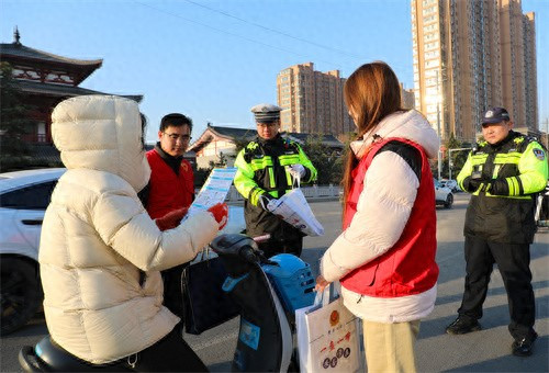 临沂在线讯(吴云富)1月12日,费县公安局交管大队组织志愿者开展“冬季守护,平安相伴”骑乘电动自行车头盔佩戴宣传劝导活动,在辖区重点路口织密安全防线。