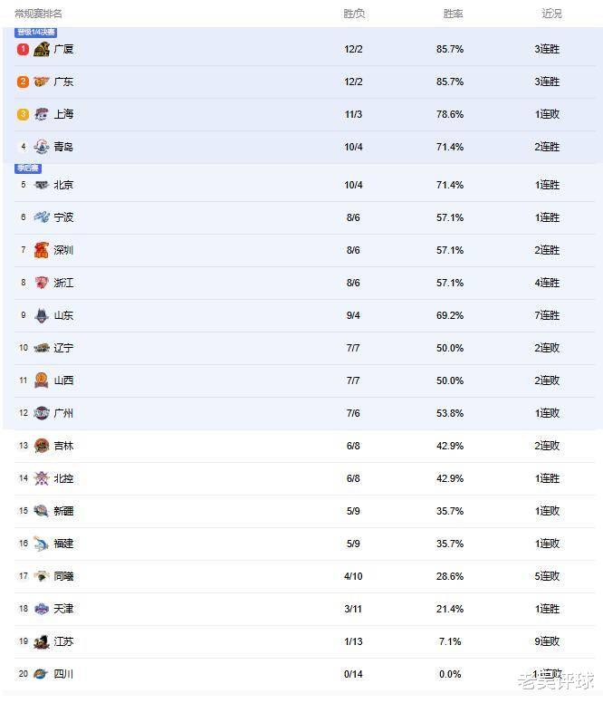看下积分榜最新排名,广东反超上海杀到第2,北京跌出前4,排在第5位。辽宁两连败后,已经跌到第10位,山西队则是排在第11位。
