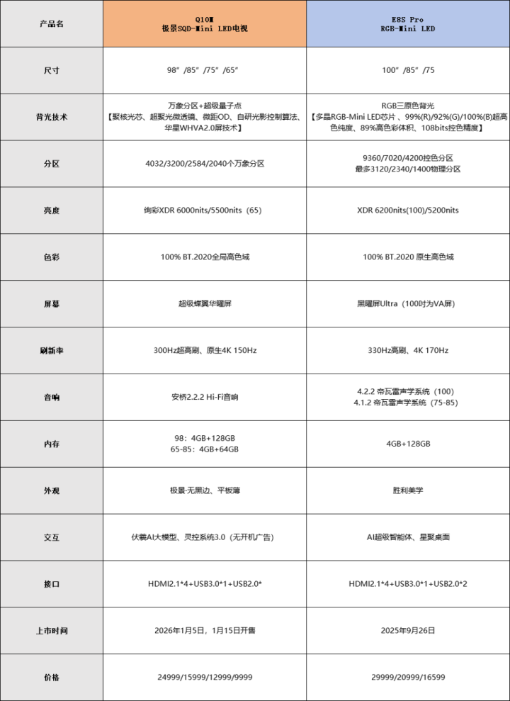 看完了TCL Q10M 极景SQD-Mini LED电视与海信E8S Pro RGB-Mini LED电视的情况,你会发现在画质方面,Q10M的表现更佳,在参数与游戏方面,E8S Pro有优势。