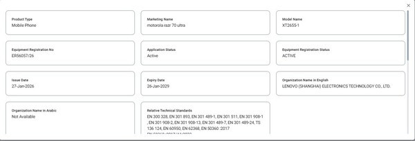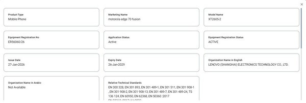 [CNMO科技消息]近日,据外媒报道,摩托罗拉多款新机现身各大认证机构,包括摩托罗拉Edge70Fusion、MotoG17、Razr70Ultra、MotoG67及MotoG77等机型。这些机型已相继出现在阿联酋TDRA、欧亚经济委员会EEC、全球认证论坛GCF等监管机构数据库中。