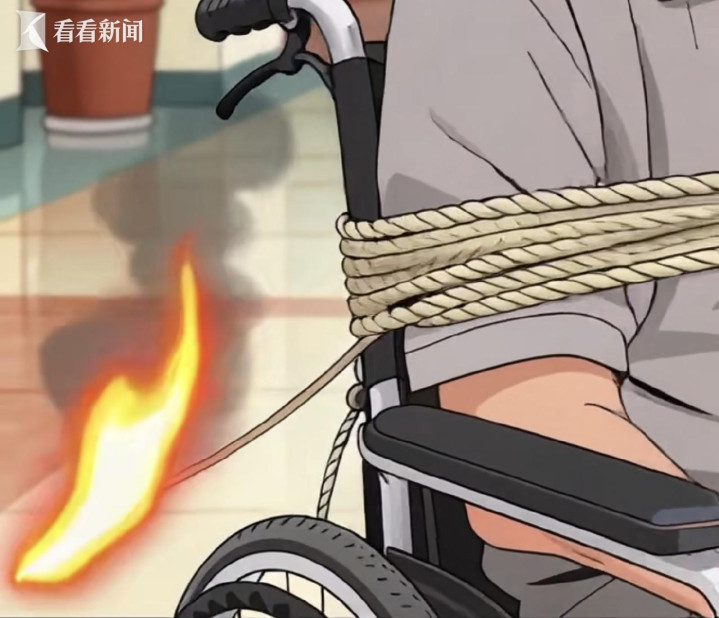 安置好老刘,孙某转身去忙别的。谁也没料到,短短五六分钟后,老刘竟自己操控轮椅,乘着电梯悄悄下到了一楼大厅,挣扎着想要挣脱绳子;3点25分,他从衣服口袋里掏出打火机,点燃了腰腹部的固定绳,绳子遇火即燃,烧断后着火垂到轮椅两侧,瞬间引燃右侧轮胎。
