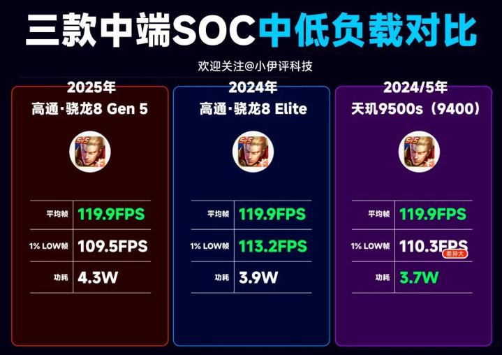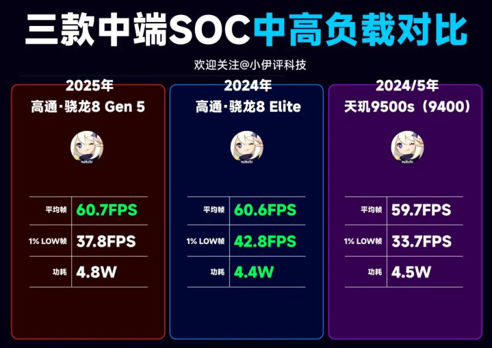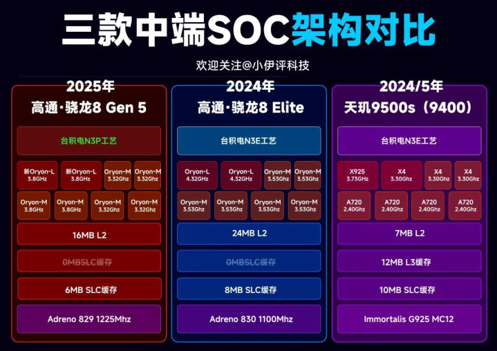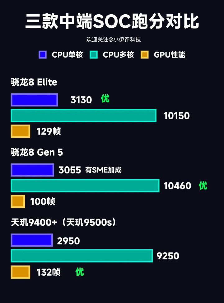 其他两款SOC——天玑9400(9500s)和骁龙8 Gen 5基本上算是半斤八两的水平。