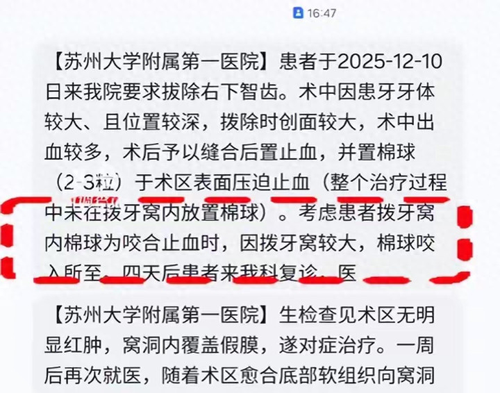 可更让他窝火的还在后面。事发后,只有拔牙医院的医生私下打了个电话,再就是收到一条院方短信。短信里的说法简直颠覆三观,居然称“考虑患者拔牙窝内棉球为咬合止血时,因拔牙窝较大,棉球咬入所致”,意思就是这棉条是男子自己咬进去的!直到现在,院方也没专人出面处理这事。