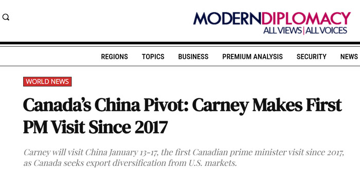 欧洲《现代外交》评论称,卡尼此次访华,是加拿大推进其对外经贸多元化战略的重要一步。报道强调,当前加拿大正深陷贸易政策不确定性困局,摆脱对美国市场的依赖已成为关乎加拿大经济稳定发展的战略必要之举。